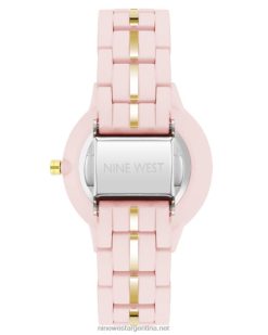 - brazalete de eslabones ajustables de goma rosa claro con línea central en tono dorado; cierre desplegable con doble pulsador de seguridad