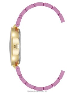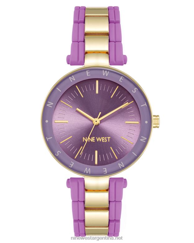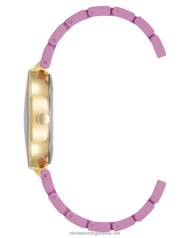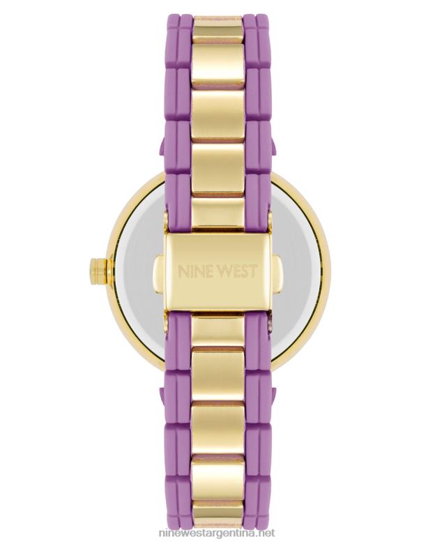 - brazalete de eslabones ajustables de goma color lavanda con eslabones centrales dorados; cierre plegable con doble botón de seguridad