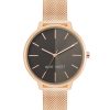 - esfera plateada texturizada con manecillas y marcadores dorados; minutero negro y verde azulado