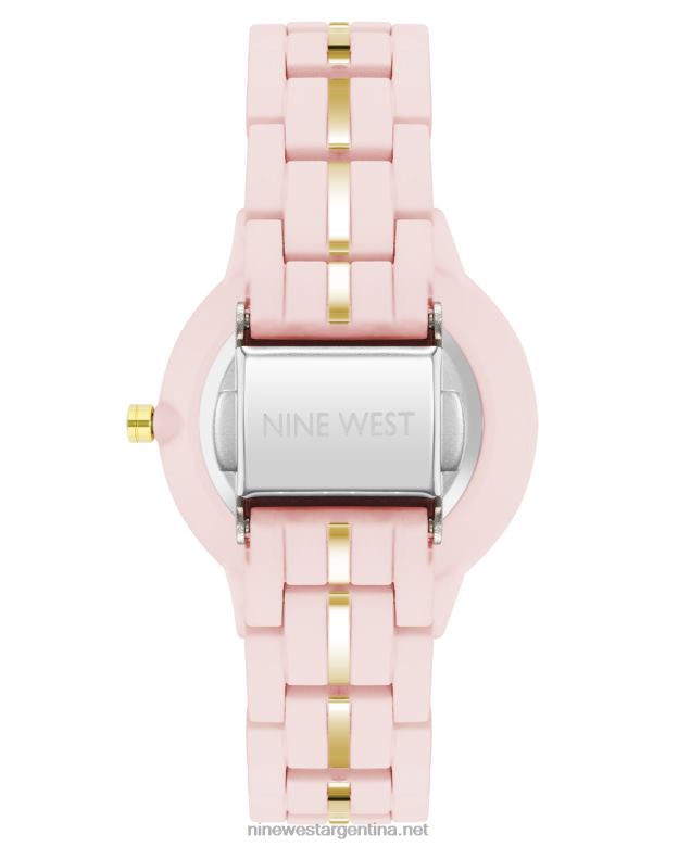 - brazalete de eslabones ajustables de goma rosa claro con línea central en tono dorado; cierre desplegable con doble pulsador de seguridad