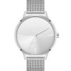 - esfera plateada texturizada con manecillas y marcadores dorados; minutero negro y verde azulado